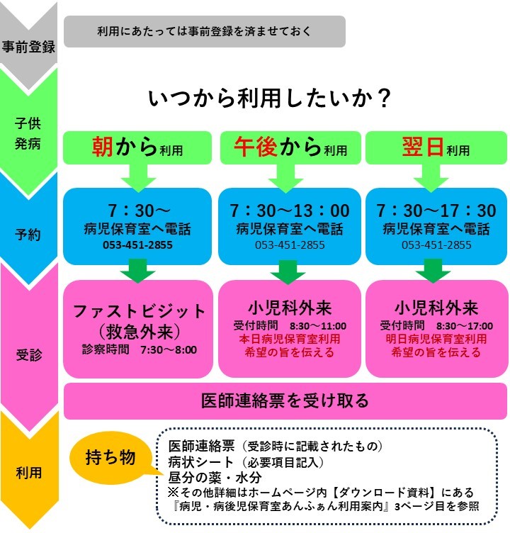 | (3)受診 | 利用には必ず医師の診察が必要。事前の診察で医師により病児・病後児保育室の利用が不可と判断される場合は受け入れお断りの場合あり。預け入れ前に必ず時間外救急ファストビジット(当日利用の場合)もしくは小児科外来(当日午後・翌日利用の場合)を受診。 |