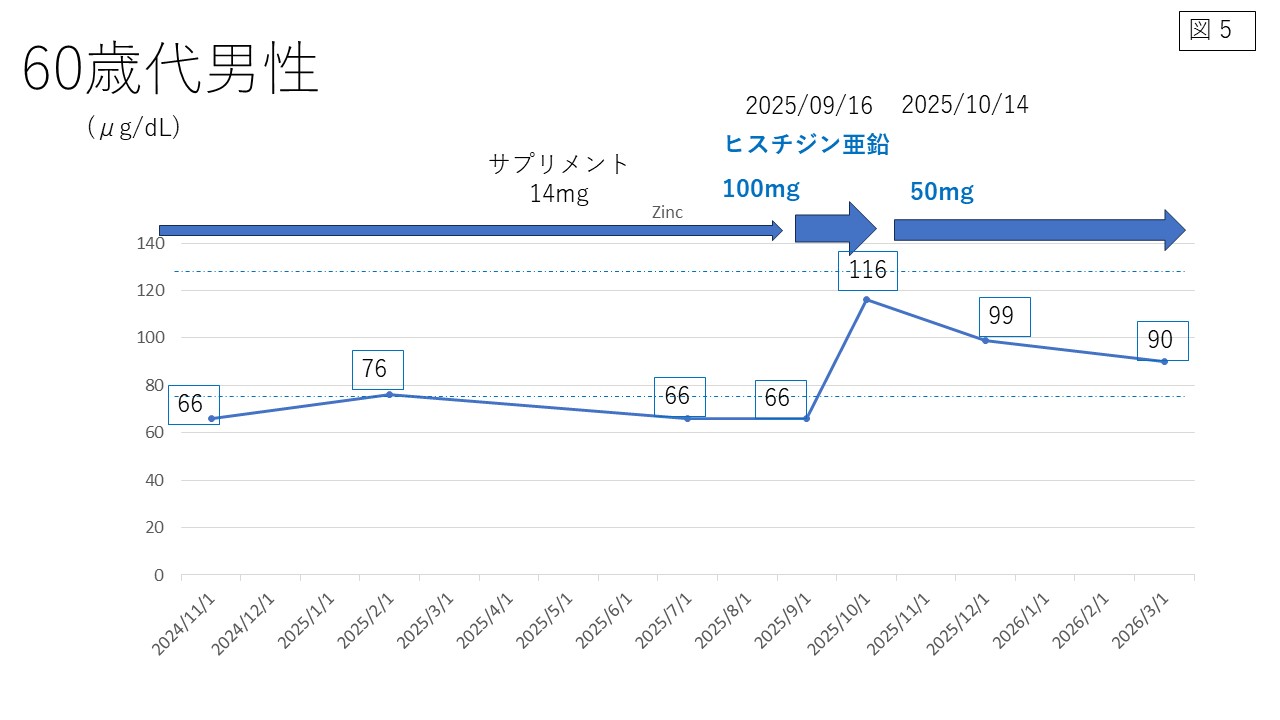 今まで、亜鉛のサプリメント14㎎を毎日飲んでいましたが、2024年11月が66㎍/dLで、2025年の9月まで低値が継続し、2025年9月16日からヒスチジン亜鉛(ジンタス)を1日量100mgで開始しました。すると、1か月後の検査で116㎍/dLと上昇(正常範囲80~130㎍/dL)。ジンタスを1日50mgに減量して、2025年12月に採血すると99㎍/dLと正常範囲でした。2026年3月の採血でも90㎍/dLと正常範囲でした。現在も、ジンタス1日50mgの内服を継続しています。さらに、お酒を飲んだ時、ジムで運動した時、疲れているときは亜鉛消費量が多くなるため、サプリメント14mgを適宜飲んでいます。