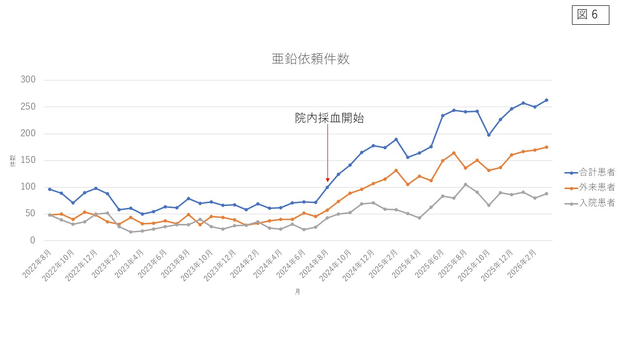 当院の亜鉛検査件数を示します、オレンジ色は外来患者・灰色は入院患者・青色はその合計数です、2024年に亜鉛院内検査とし、当日、結果が判明するようにしました。