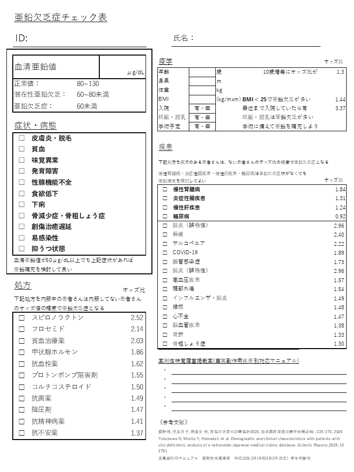 - Yokokawa H, Morita Y, Hamada I, et al. Demographic and clinical characteristics with patients with zinc deficienct: analysis of a nationwide Japanese medical claims database. Scientic Reports.2024; 14 2791 文中では【Yokokawa論文】と表示します