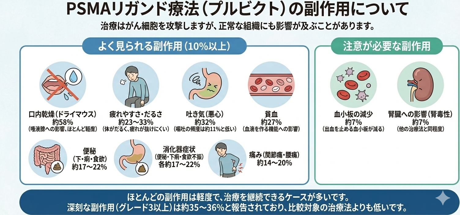 - 主な副作用: 最も頻度の高い有害事象は「口内乾燥(ドライマウス)」であり、他に「疲労」、「吐き気(悪心)」、「貧血」などが報告されています。