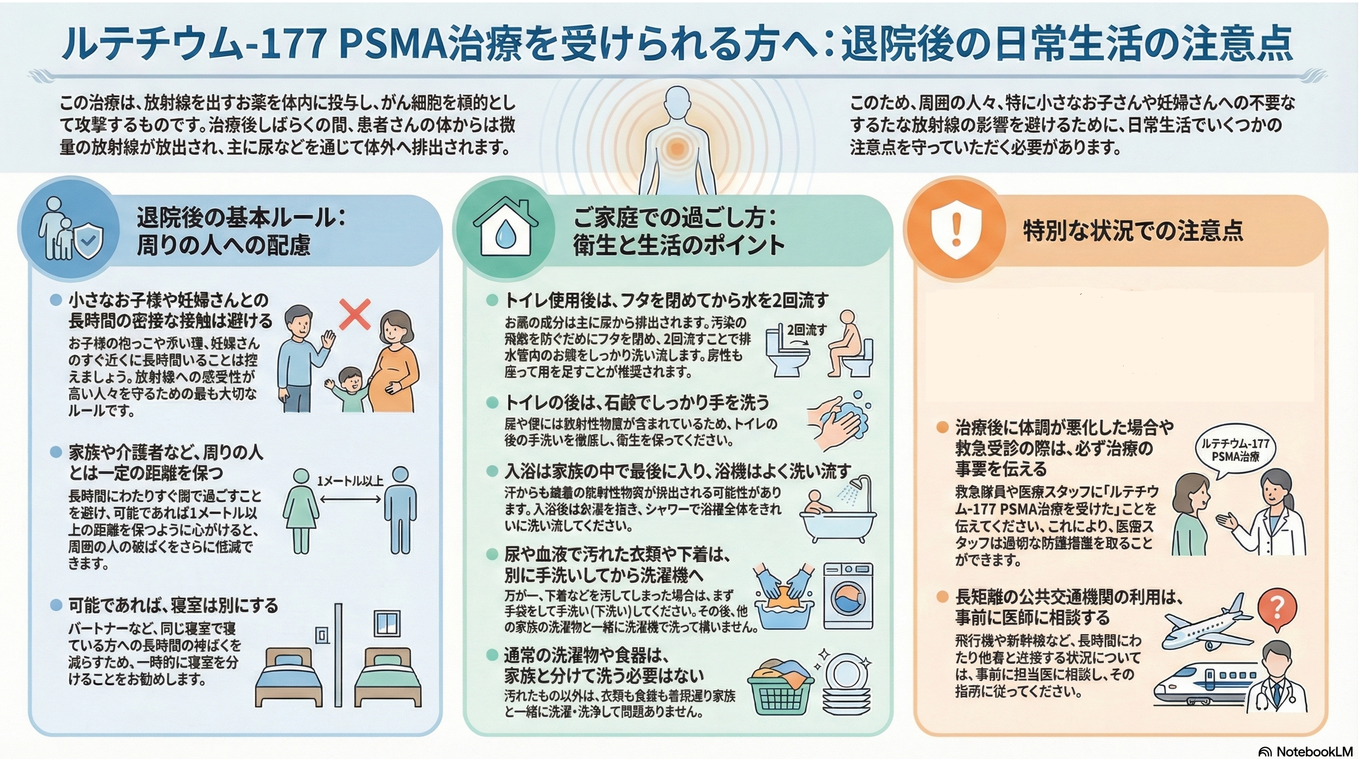- 放射線防護: 投与後は体外に放射線が放出されているため、周囲の人々(家族や公衆)の被ばくを避けるための生活上の制限(トイレの洗浄、接触制限など)が設けられています。
