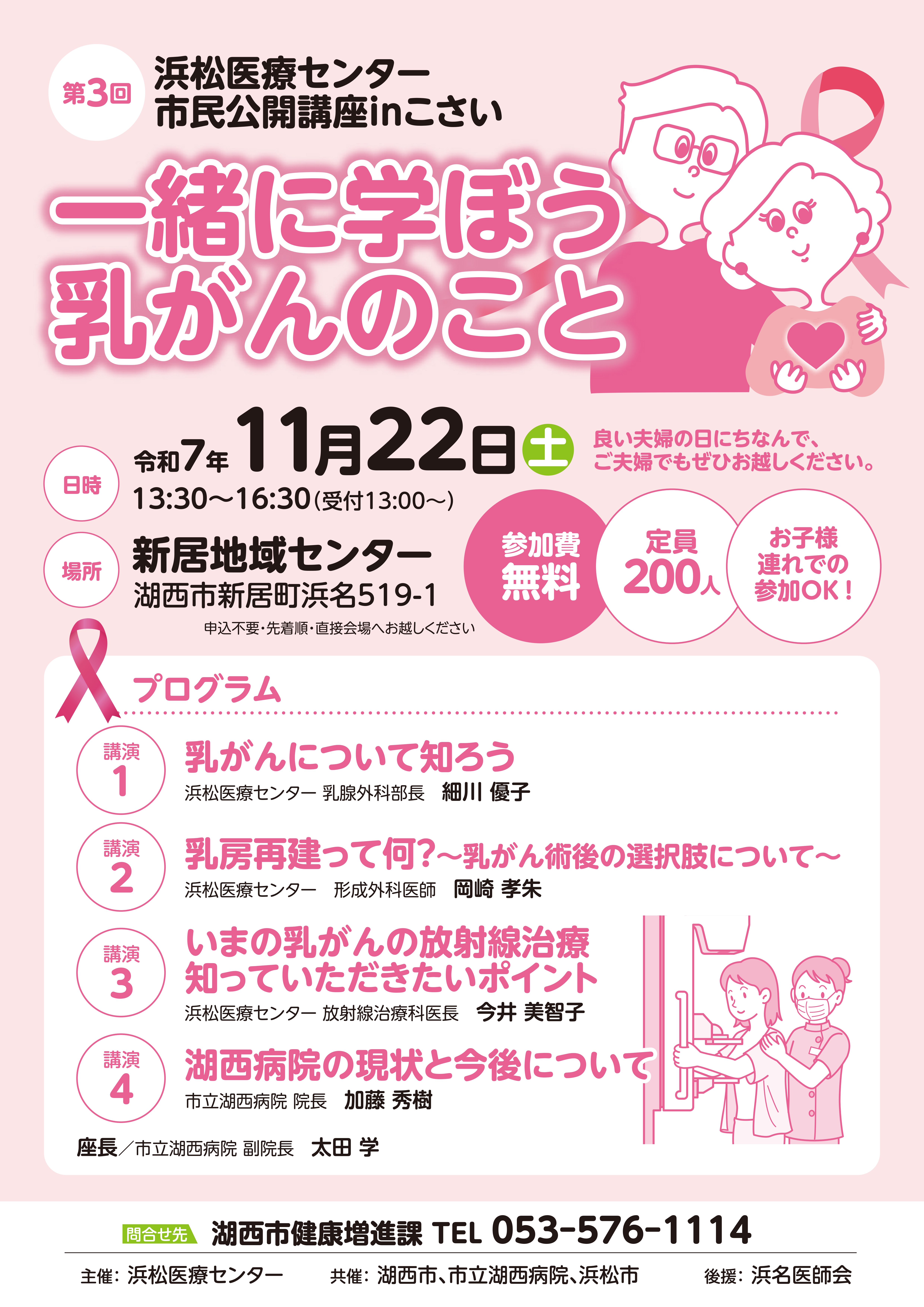 「第3回 浜松医療センター市民公開講座 in こさい」開催について 第3回 浜松医療センター市民公開講座 in こさい『一緒に学ぼう 乳がんのこと』を開催します。ぜひ、ご参加ください。 日時:2025年11月22日(土)13:30-16:30(受付13:00~) 会場:湖西市新居町浜名519-1 新居地域センター 料金:無料 定員:200人(予約不要) 講演内容等、詳しくは下記のポスターをご覧ください。