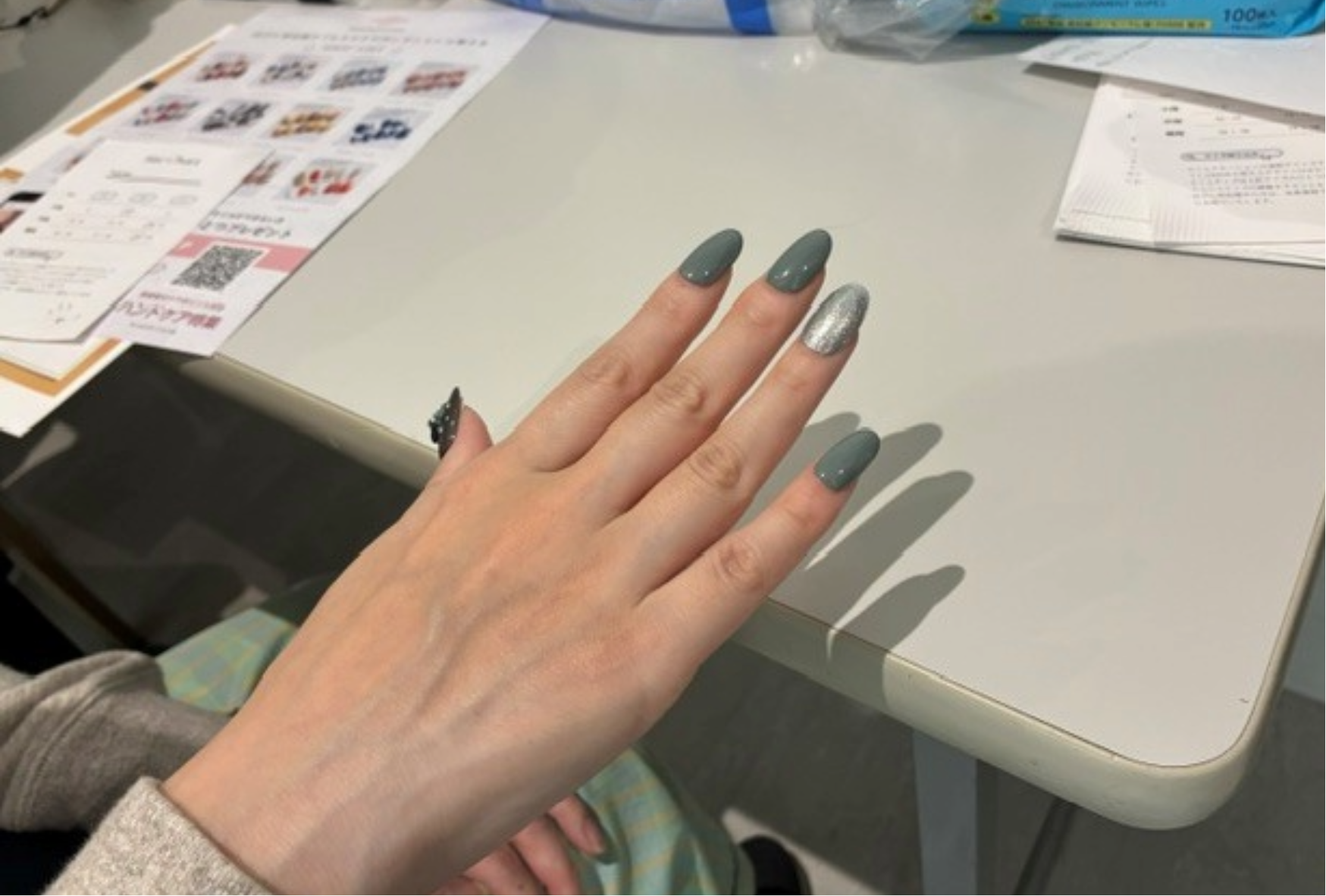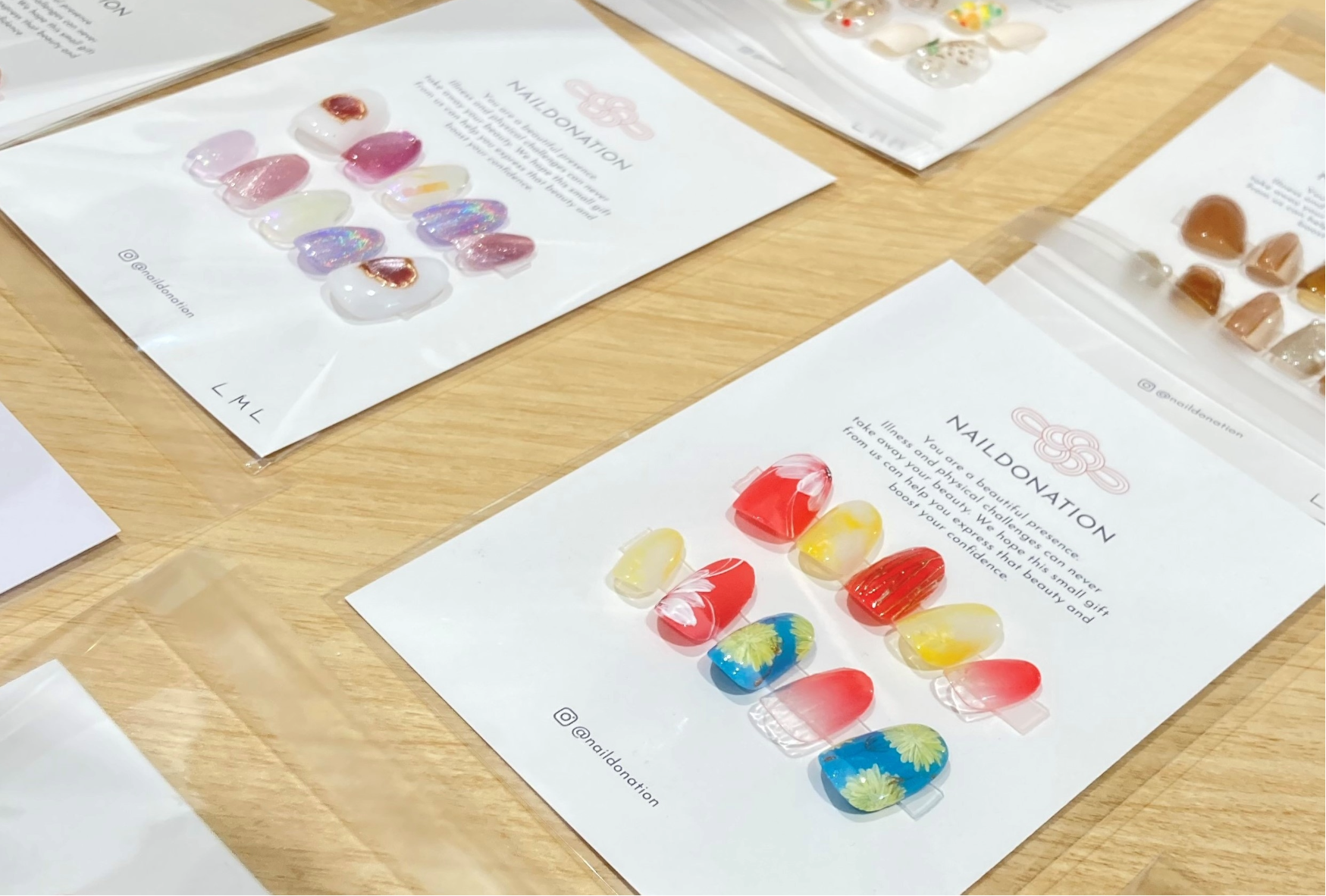 活動を行っている株式会社ビューティースマイルの方からネイルドネーションについてミニレクチャーを受けたのちネイルチップの装着体験と体験者にはネイルチップのプレゼントがありました。体験した患者さんは爪のサイズを測定してもらい、自分にあったサイズのネイルチップを楽しそうに選ばれていました。体験した患者さんが、自然と笑顔になっている様子にスタッフも笑顔になりました。
