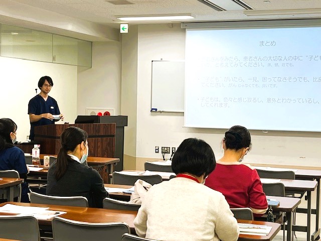 本セミナーでは「明日から使える」をキーワードに対処の引き出しを増やし実践に役立つ内容をお伝えしています。今回は緩和ケアチームの小児科比良先生に講演いただきました。がん診療の重点課題の一つであるAYA世代患者さんへの支援の中には子どもを含む家族のケアも含まれます。実際に緩和ケアチームで実践しているケアや子どもへの伝え方などより実践的な内容までお話しいただきました。
