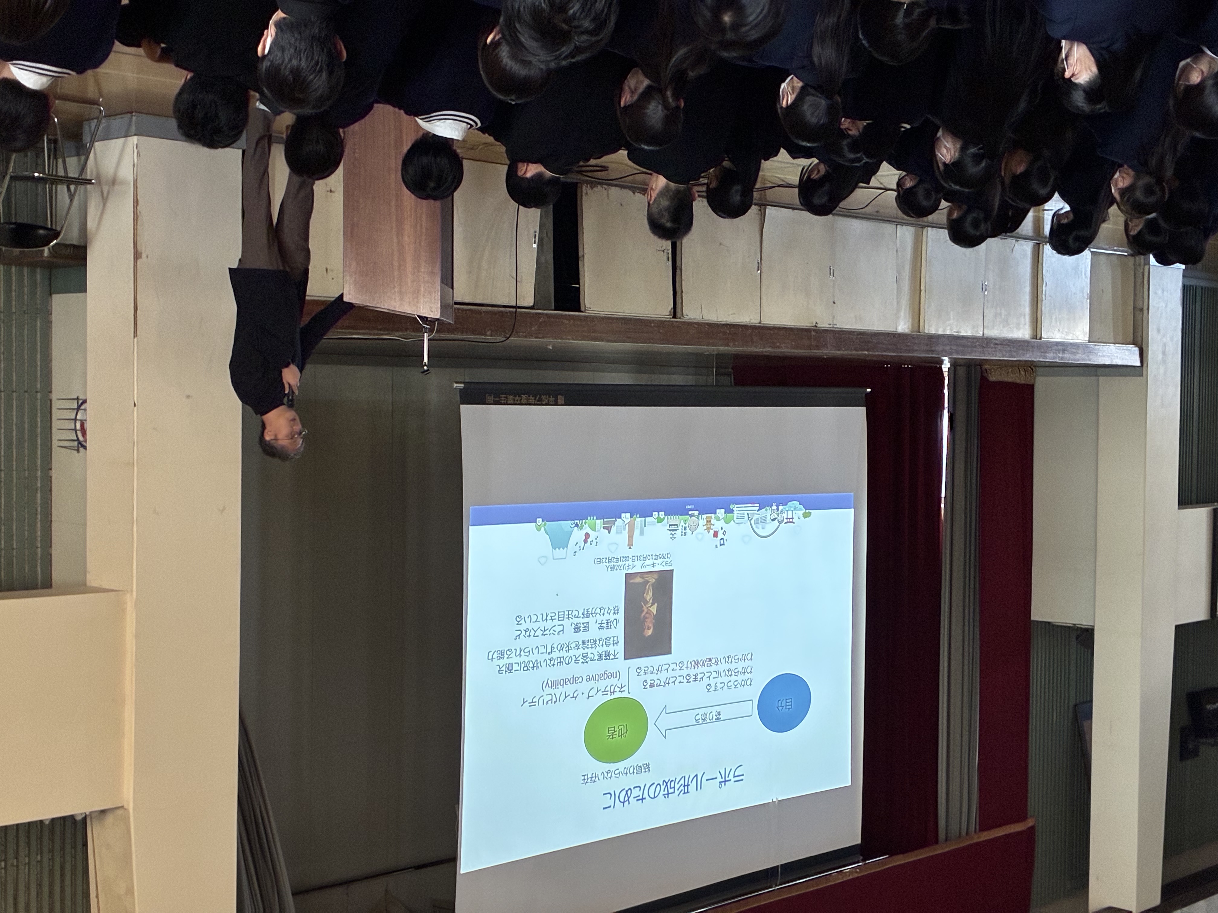 講師は、がんとはどんな病気かを話した後、身近でつらい思いをしている他者への寄り添い方(緩和ケア)がいかに重要であるかを説明しました。高校生相手にがん教育を実施したのは初めてで、礼儀正しく、落ち着いて聴講していた姿が印象的でした。