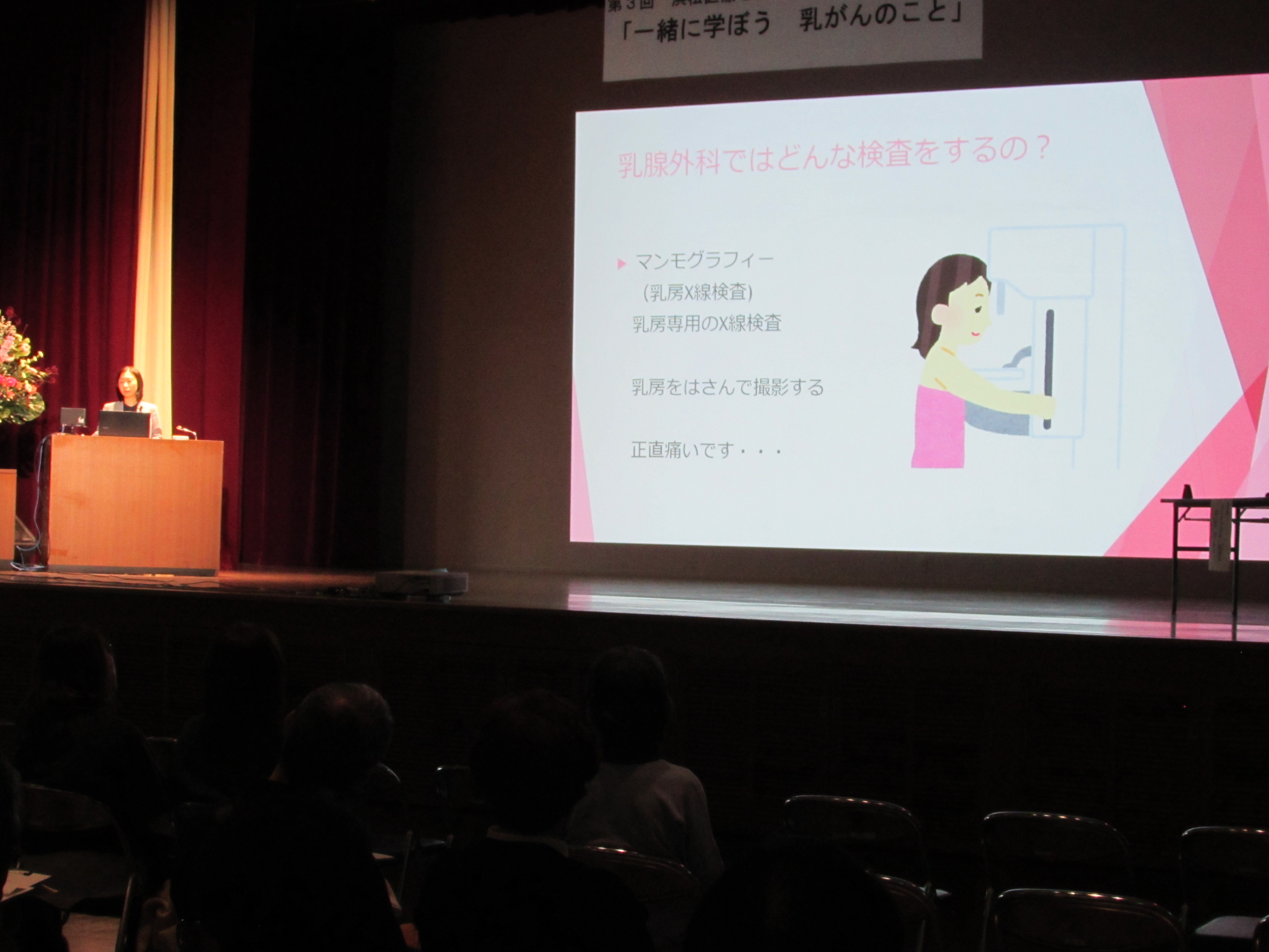 2025年11月22日、第3回 浜松医療センター市民公開講座 in こさい『一緒に学ぼう 乳がんのこと』を湖西市新居町の新居地域センターにて開催しました。2022年に浜松市と湖西市が締結した地域医療提供体制確保の連携協定に基づき開催をしており、「知らなかった乳がんのことを詳しく知れてよかった」などアンケートの意見をいただいて好評でした。ご参加いただき、ありがとうございました。
