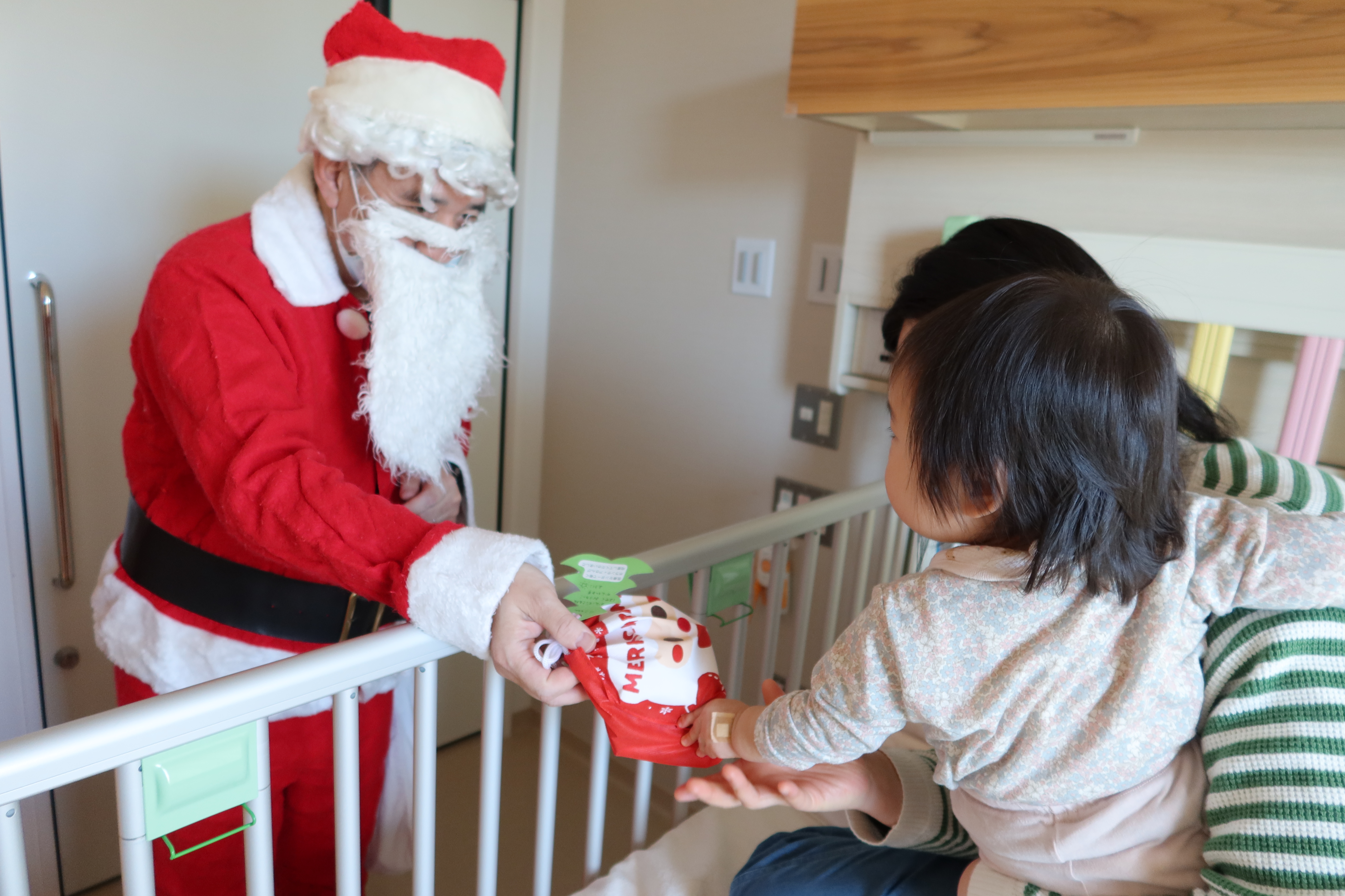 令和7年12月18日、小児病棟で入院中の子どもたちにクリスマスの雰囲気を楽しんでもらおうと、クリスマス会が開かれました。今年もサンタクロースやトナカイの衣装を着た医師が病室をまわって、子どもたちにプレゼントを手渡しました。