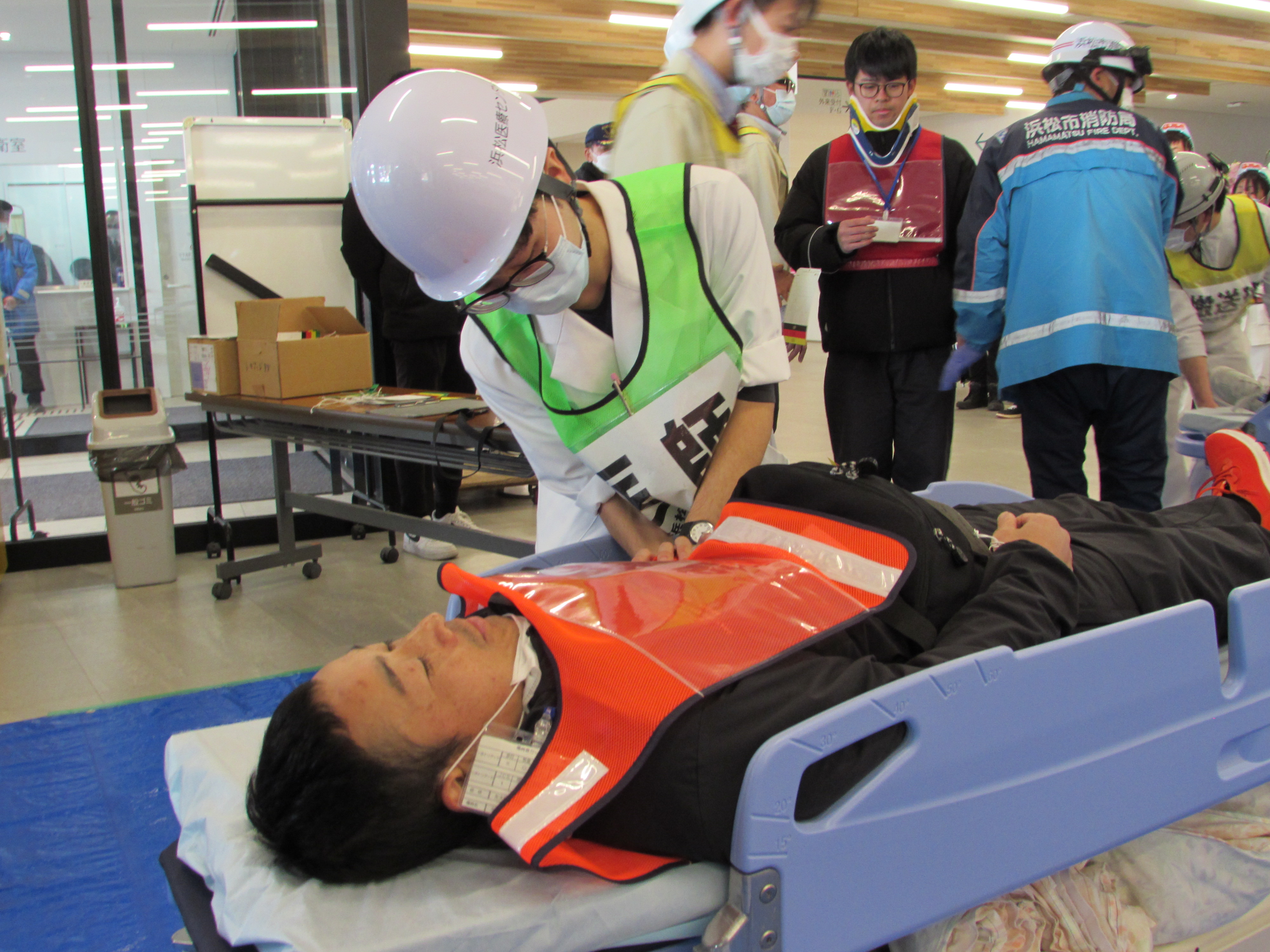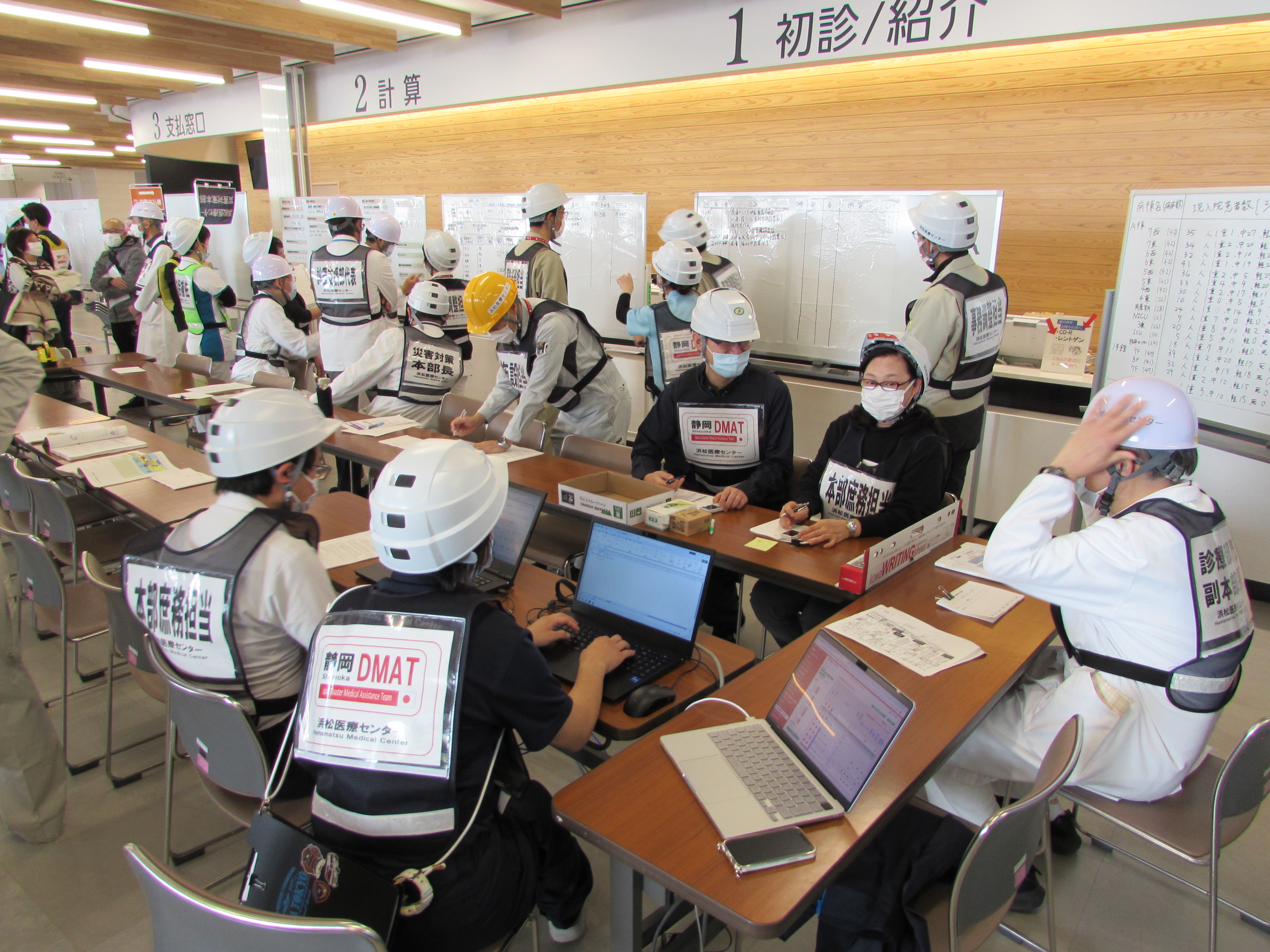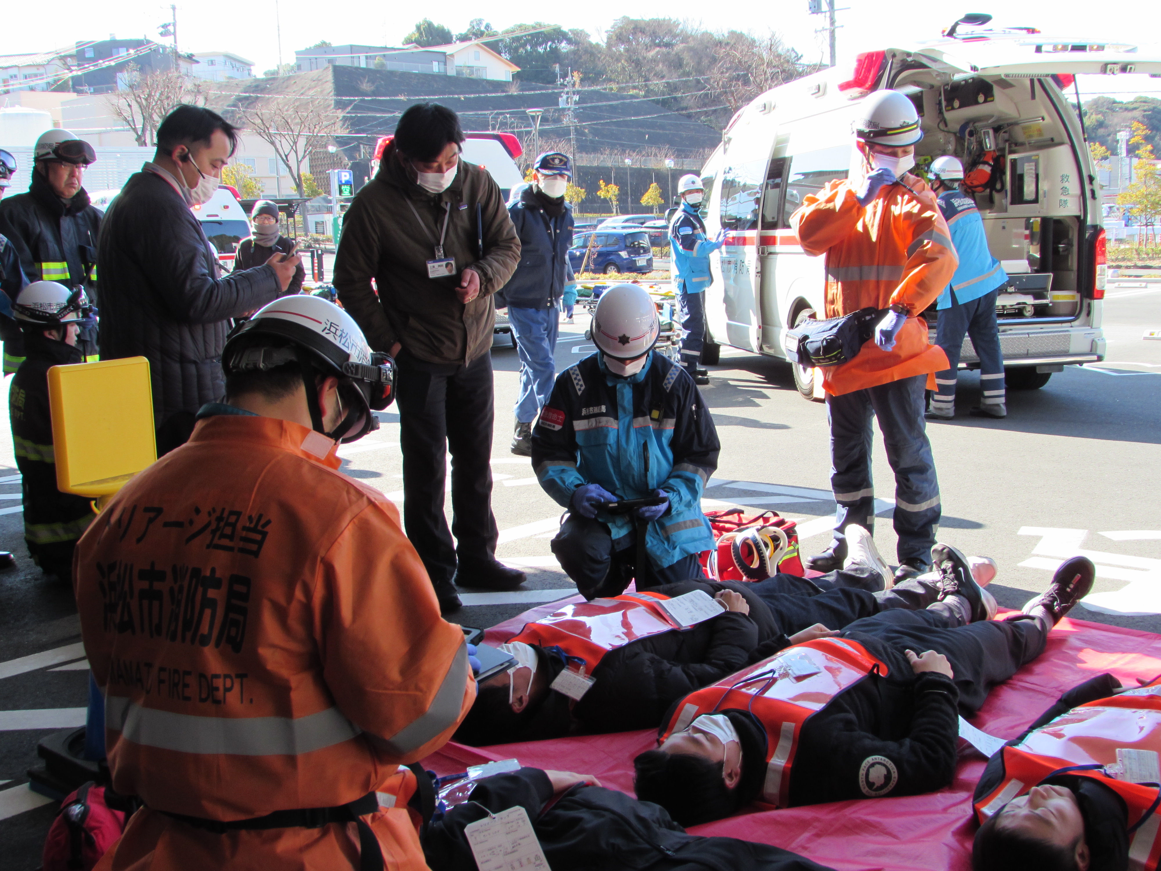 訓練は、南海トラフ巨大地震の発生から3時間が経過した状況を想定し行われ、重症度に応じて治療の優先順位を判断する「トリアージ」を中心に一次・二次トリアージから治療、さらに搬送までの一連の流れを確認しました。また、浜松市消防局との共同災害訓練も行いました。